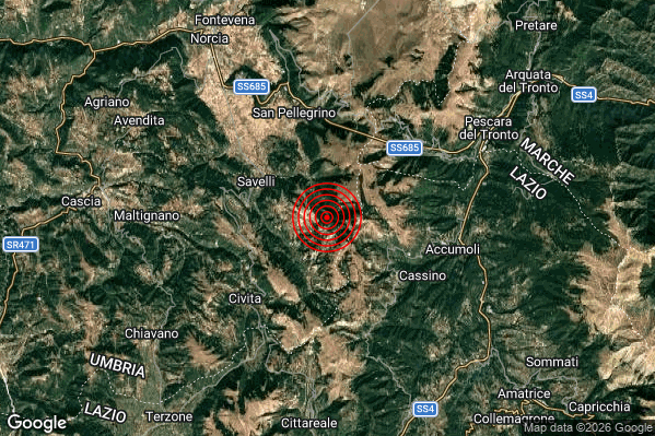 Oggi 11/03/2026 alle ore 04:37:07 (ora locale Italiana – 03:37:07 UTC) è stato registrato un Debole #Terremoto di magnitudo M2.4 con epicentro “7 km W Accumoli (RI)” Latitudine: 42.71 Longitudine: 13.17 mostrato sulla mappa.