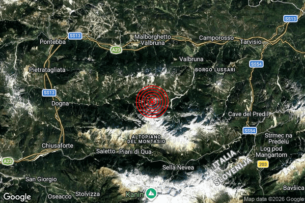 Oggi 14/03/2026 alle ore 07:04:38 (ora locale Italiana – 06:04:38 UTC) è stato registrato un Lieve #Terremoto di magnitudo M2.2 con epicentro “6 km S Malborghetto Valbruna (UD)” Latitudine: 46.45 Longitudine: 13.44 mostrato sulla mappa.