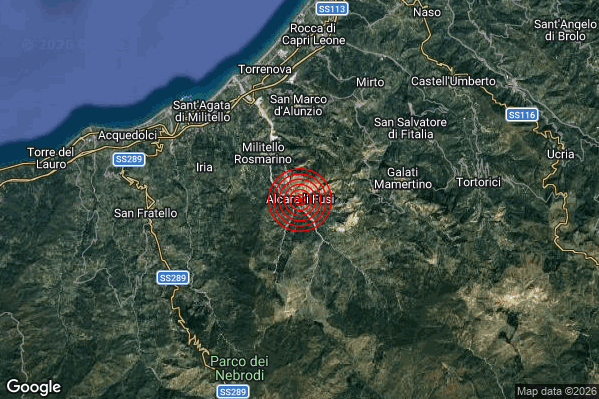 Oggi 15/03/2026 alle ore 06:21:26 (ora locale Italiana – 05:21:26 UTC) è stato registrato un Lieve #Terremoto di magnitudo M2.1 con epicentro “Alcara li Fusi (ME)” Latitudine: 38.02 Longitudine: 14.7 mostrato sulla mappa.