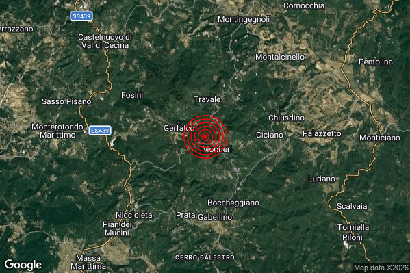 Oggi 15/03/2026 alle ore 22:22:35 (ora locale Italiana – 21:22:35 UTC) è stato registrato un Lieve #Terremoto di magnitudo M2.0 con epicentro “1 km NW Montieri (GR)” Latitudine: 43.14 Longitudine: 11 mostrato sulla mappa.