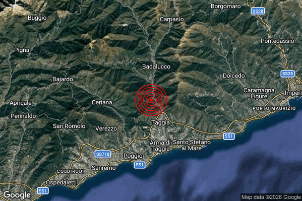 Oggi 21/03/2026 alle ore 11:07:54 (ora locale Italiana – 10:07:54 UTC) è stato registrato un Debole #Terremoto di magnitudo M2.5 con epicentro “3 km NW Castellaro (IM)” Latitudine: 43.88 Longitudine: 7.84 mostrato sulla mappa.
