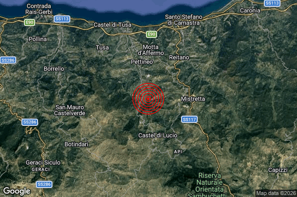 Oggi 21/03/2026 alle ore 19:26:04 (ora locale Italiana – 18:26:04 UTC) è stato registrato un Lieve #Terremoto di magnitudo M2.0 con epicentro “4 km N Castel di Lucio (ME)” Latitudine: 37.93 Longitudine: 14.3 mostrato sulla mappa.