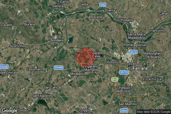 Oggi 23/03/2026 alle ore 23:04:47 (ora locale Italiana – 22:04:47 UTC) è stato registrato un Debole #Terremoto di magnitudo M2.3 con epicentro “2 km NW Vigarano Mainarda (FE)” Latitudine: 44.86 Longitudine: 11.49 mostrato sulla mappa.