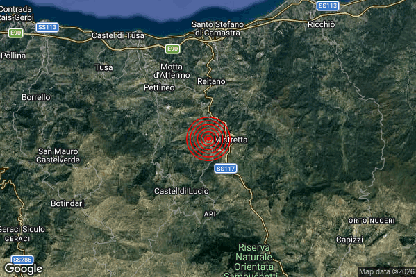 Oggi 25/03/2026 alle ore 05:20:40 (ora locale Italiana – 04:20:40 UTC) è stato registrato un Lieve #Terremoto di magnitudo M2.1 con epicentro “2 km W Mistretta (ME)” Latitudine: 37.93 Longitudine: 14.34 mostrato sulla mappa.