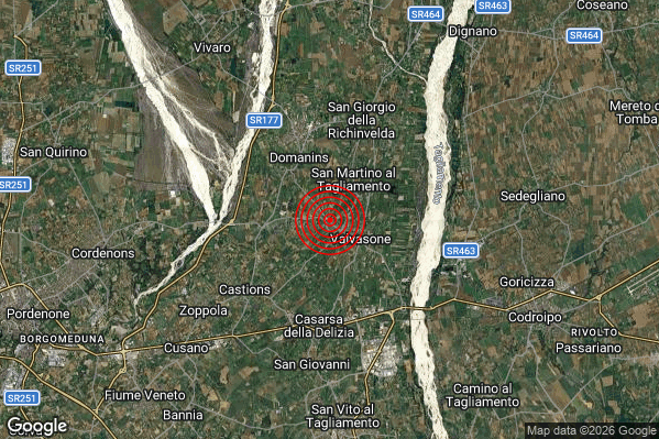Oggi 25/03/2026 alle ore 12:31:13 (ora locale Italiana – 11:31:13 UTC) è stato registrato un Debole #Terremoto di magnitudo M2.6 con epicentro “1 km NW Valvasone Arzene (PN)” Latitudine: 46 Longitudine: 12.85 mostrato sulla mappa.