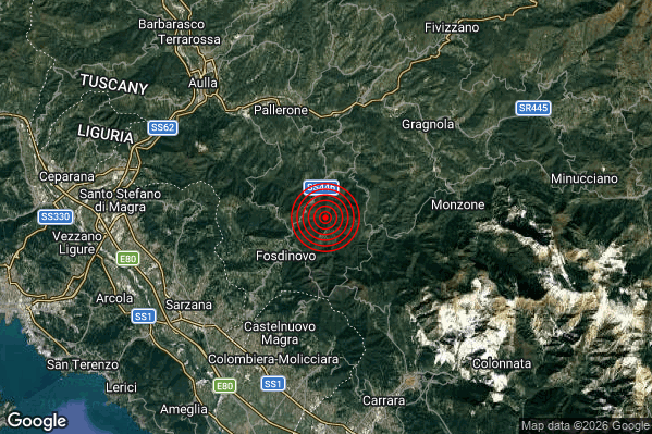 Oggi 25/03/2026 alle ore 12:58:18 (ora locale Italiana – 11:58:18 UTC) è stato registrato un Lieve #Terremoto di magnitudo M2.0 con epicentro “3 km NE Fosdinovo (MS)” Latitudine: 44.15 Longitudine: 10.05 mostrato sulla mappa.