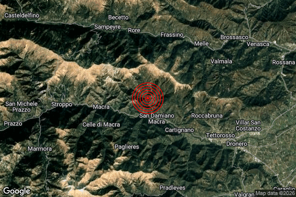 Oggi 26/03/2026 alle ore 02:22:04 (ora locale Italiana – 01:22:04 UTC) è stato registrato un Debole #Terremoto di magnitudo M2.4 con epicentro “2 km NW San Damiano Macra (CN)” Latitudine: 44.51 Longitudine: 7.24 mostrato sulla mappa.