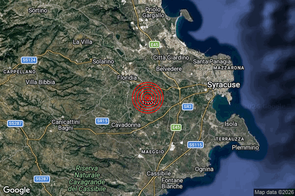 Oggi 26/03/2026 alle ore 12:54:53 (ora locale Italiana – 11:54:53 UTC) è stato registrato un Lieve #Terremoto di magnitudo M2.0 con epicentro “3 km SE Floridia (SR)” Latitudine: 37.06 Longitudine: 15.18 mostrato sulla mappa.