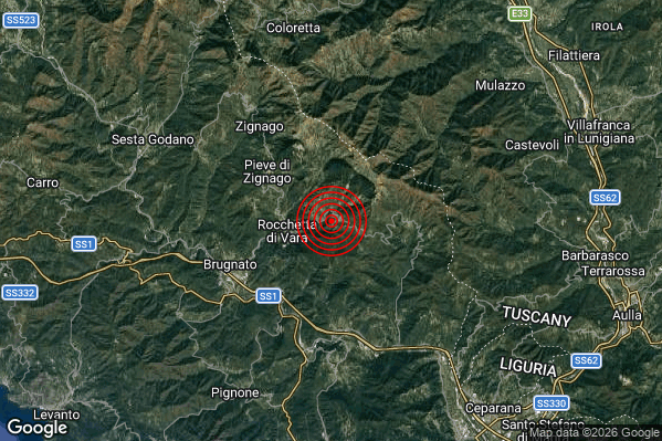 Oggi 27/03/2026 alle ore 02:19:40 (ora locale Italiana – 01:19:40 UTC) è stato registrato un Debole #Terremoto di magnitudo M2.6 con epicentro “2 km E Rocchetta di Vara (SP)” Latitudine: 44.26 Longitudine: 9.78 mostrato sulla mappa.