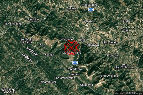 Oggi 30/03/2026 alle ore 00:55:02 (ora locale Italiana – 22:55:02 UTC) è stato registrato un Debole #Terremoto di magnitudo M2.3 con epicentro “3 km SW Cagli (PU)” Latitudine: 43.53 Longitudine: 12.62 mostrato sulla mappa.