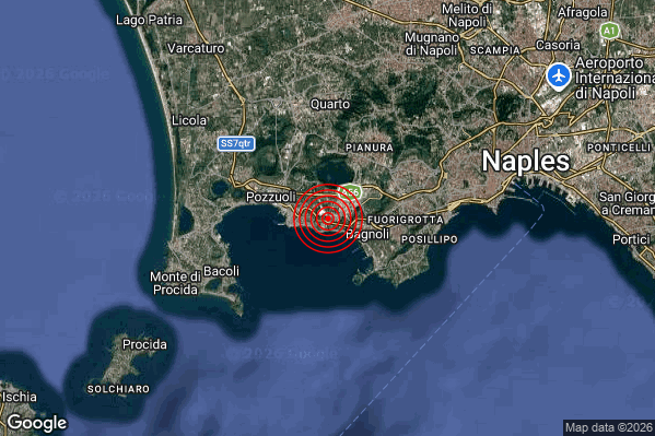 Oggi 07/04/2026 alle ore 04:38:34 (ora locale Italiana – 02:38:34 UTC) è stato registrato un Debole #Terremoto di magnitudo M2.6 con epicentro “Campi Flegrei” Latitudine: 40.82 Longitudine: 14.14 mostrato sulla mappa.