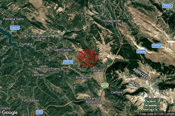 Oggi 12/04/2026 alle ore 10:39:26 (ora locale Italiana – 08:39:26 UTC) è stato registrato un Lieve #Terremoto di magnitudo M2.1 con epicentro “4 km N Borgorose (RI)” Latitudine: 42.23 Longitudine: 13.24 mostrato sulla mappa.
