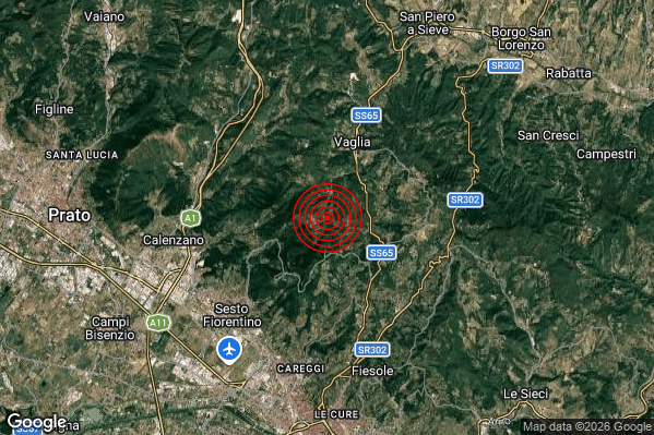 Oggi 16/04/2026 alle ore 04:05:32 (ora locale Italiana – 02:05:32 UTC) è stato registrato un Lieve #Terremoto di magnitudo M2.1 con epicentro “4 km SW Vaglia (FI)” Latitudine: 43.88 Longitudine: 11.26 mostrato sulla mappa.