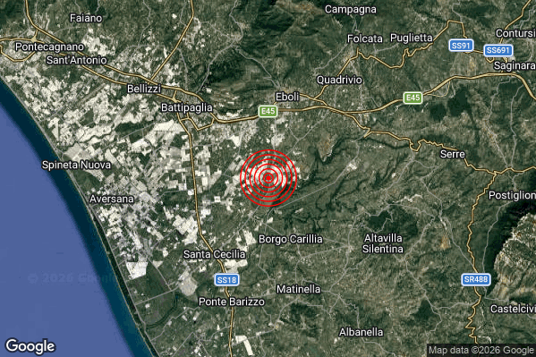 Oggi 20/04/2026 alle ore 20:47:24 (ora locale Italiana – 18:47:24 UTC) è stato registrato un Moderato #Terremoto di magnitudo M3.6 con epicentro “6 km S Eboli (SA)” Latitudine: 40.57 Longitudine: 15.04 mostrato sulla mappa.