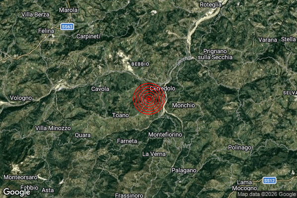 Oggi 22/04/2026 alle ore 02:06:00 (ora locale Italiana – 00:06:00 UTC) è stato registrato un Debole #Terremoto di magnitudo M2.4 con epicentro “4 km E Toano (RE)” Latitudine: 44.39 Longitudine: 10.6 mostrato sulla mappa.