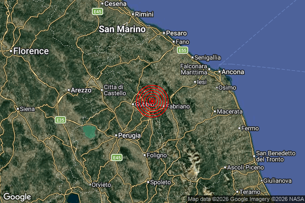 Oggi 22/04/2026 alle ore 06:02:24 (ora locale Italiana – 04:02:24 UTC) è stato registrato un Lieve #Terremoto di magnitudo M2.1 con epicentro “6 km E Costacciaro (PG)” Latitudine: 43.38 Longitudine: 12.78 mostrato sulla mappa.