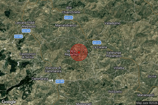 Oggi 23/04/2026 alle ore 05:12:09 (ora locale Italiana – 03:12:09 UTC) è stato registrato un Lieve #Terremoto di magnitudo M2.2 con epicentro “8 km W Vallelunga Pratameno (CL)” Latitudine: 37.69 Longitudine: 13.74 mostrato sulla mappa.