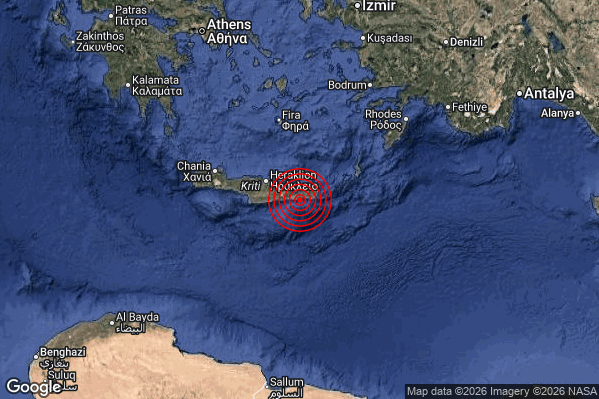 Oggi 24/04/2026 alle ore 05:18:55 (ora locale Italiana – 03:18:55 UTC) è stato registrato un Violento #Terremoto di magnitudo M5.8 con epicentro “Crete Greece [Sea: Greece]” Latitudine: 35.01 Longitudine: 25.86 mostrato sulla mappa.