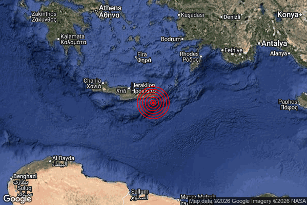 Oggi 25/04/2026 alle ore 03:47:39 (ora locale Italiana – 01:47:39 UTC) è stato registrato un Intenso #Terremoto di magnitudo M4.6 con epicentro “Crete Greece [Sea: Greece]” Latitudine: 34.84 Longitudine: 26.17 mostrato sulla mappa.