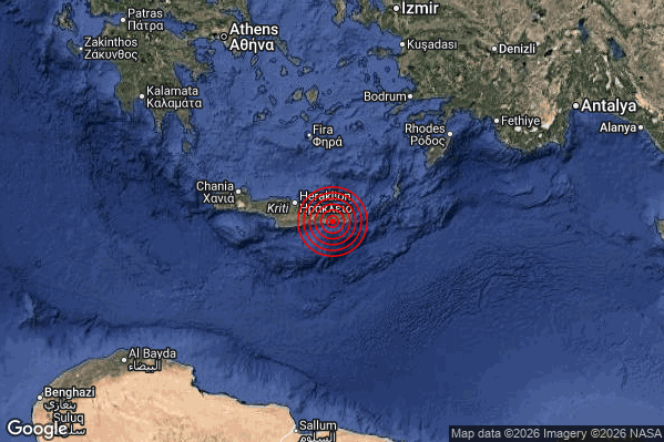 Oggi 25/04/2026 alle ore 21:50:01 (ora locale Italiana – 19:50:01 UTC) è stato registrato un Forte #Terremoto di magnitudo M4.9 con epicentro “Crete Greece [Land: Greece]” Latitudine: 35.04 Longitudine: 25.87 mostrato sulla mappa.