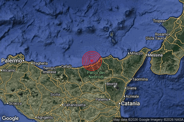 Oggi 27/04/2026 alle ore 05:43:27 (ora locale Italiana – 03:43:27 UTC) è stato registrato un Lieve #Terremoto di magnitudo M2.2 con epicentro “Costa Siciliana nord-orientale (Messina)” Latitudine: 38.11 Longitudine: 14.58 mostrato sulla mappa.