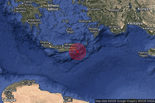 Oggi 27/04/2026 alle ore 09:45:07 (ora locale Italiana – 07:45:07 UTC) è stato registrato un Intenso #Terremoto di magnitudo M4.6 con epicentro “Crete Greece [Sea: Greece]” Latitudine: 34.95 Longitudine: 26.37 mostrato sulla mappa.