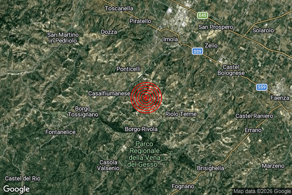 Oggi 28/04/2026 alle ore 01:07:31 (ora locale Italiana – 23:07:31 UTC) è stato registrato un Lieve #Terremoto di magnitudo M2.2 con epicentro “4 km W Riolo Terme (RA)” Latitudine: 44.29 Longitudine: 11.68 mostrato sulla mappa.