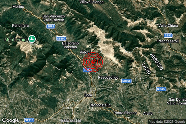 Oggi 29/04/2026 alle ore 13:36:21 (ora locale Italiana – 11:36:21 UTC) è stato registrato un Debole #Terremoto di magnitudo M2.5 con epicentro “4 km NW Pescosolido (FR)” Latitudine: 41.77 Longitudine: 13.62 mostrato sulla mappa.