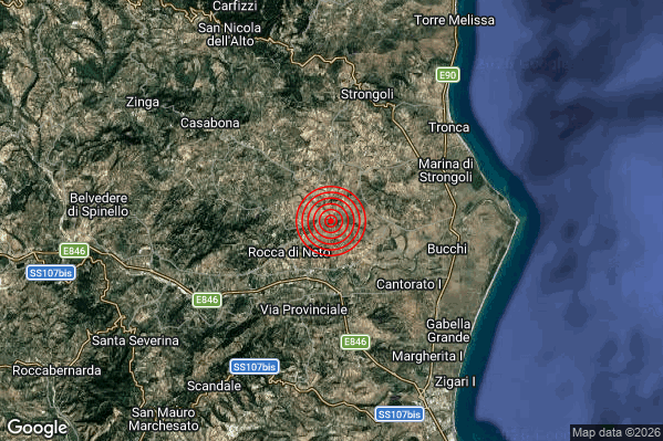 Oggi 30/04/2026 alle ore 21:30:17 (ora locale Italiana – 19:30:17 UTC) è stato registrato un Lieve #Terremoto di magnitudo M2.2 con epicentro “3 km E Rocca di Neto (KR)” Latitudine: 39.2 Longitudine: 17.03 mostrato sulla mappa.